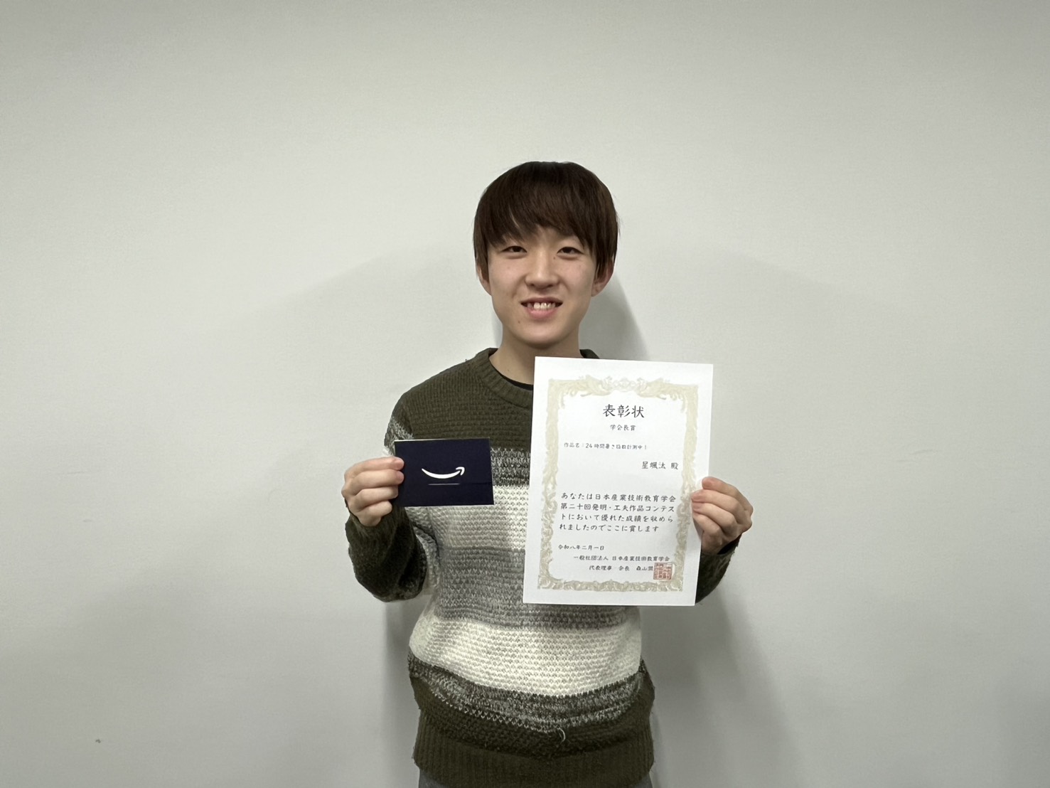 学部2年生の星颯太さんが「技術教育創造の世界(大学生版)発明・工夫コンテスト」において、学会長賞を受賞しました。